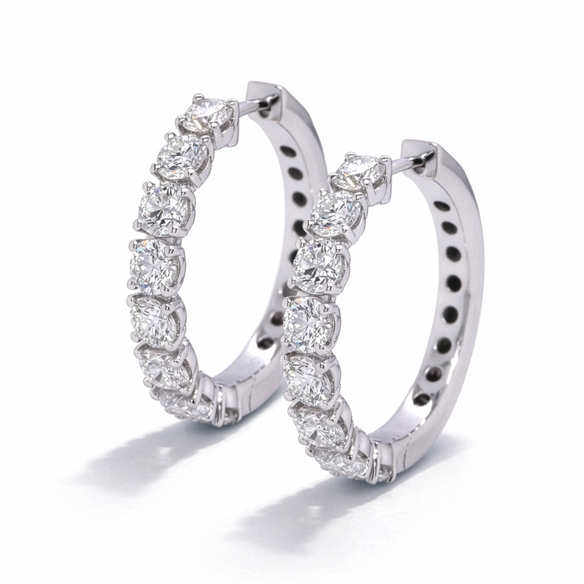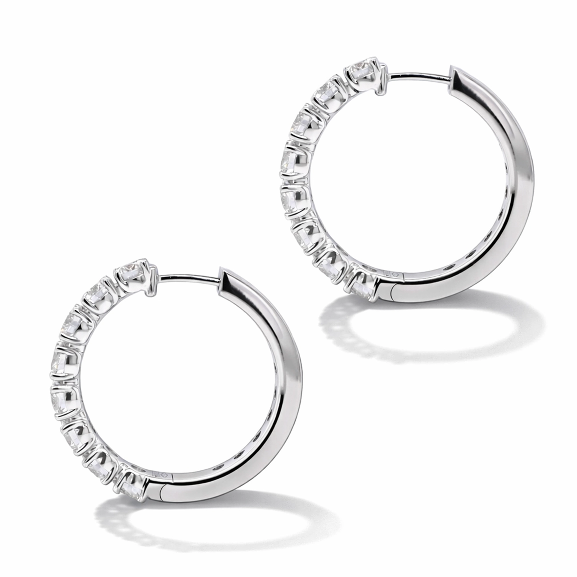 Diamonds are set along the front of the hoops to maximize light return while keeping the design refined and wearable.