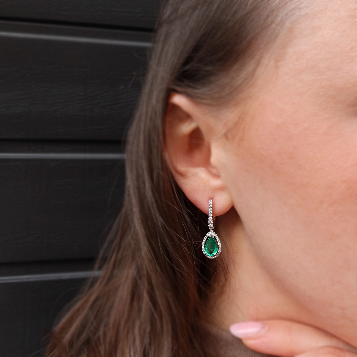 The setting is further accented with natural diamonds totaling 0.45 carats, graded D–E color and IF/VVS clarity, set both around the emeralds and along the upper drop for added sparkle and continuity.