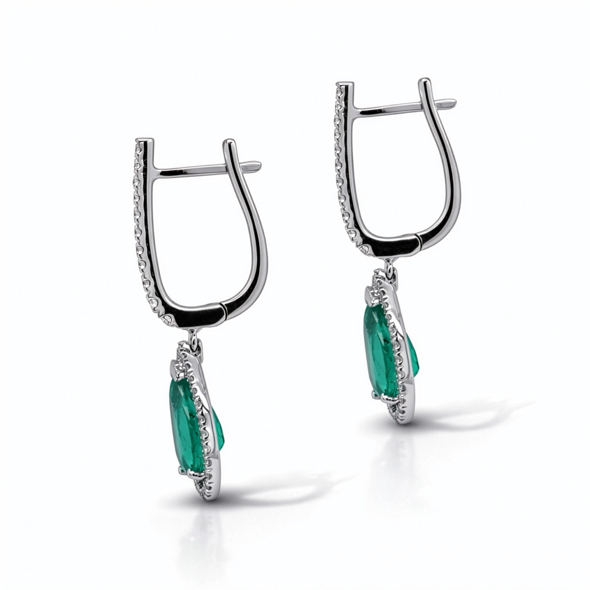 These 18K white gold drop earrings showcase a pair of natural pear-cut emeralds with a total weight of 2.34 carats, selected for their vivid green color and natural brilliance.