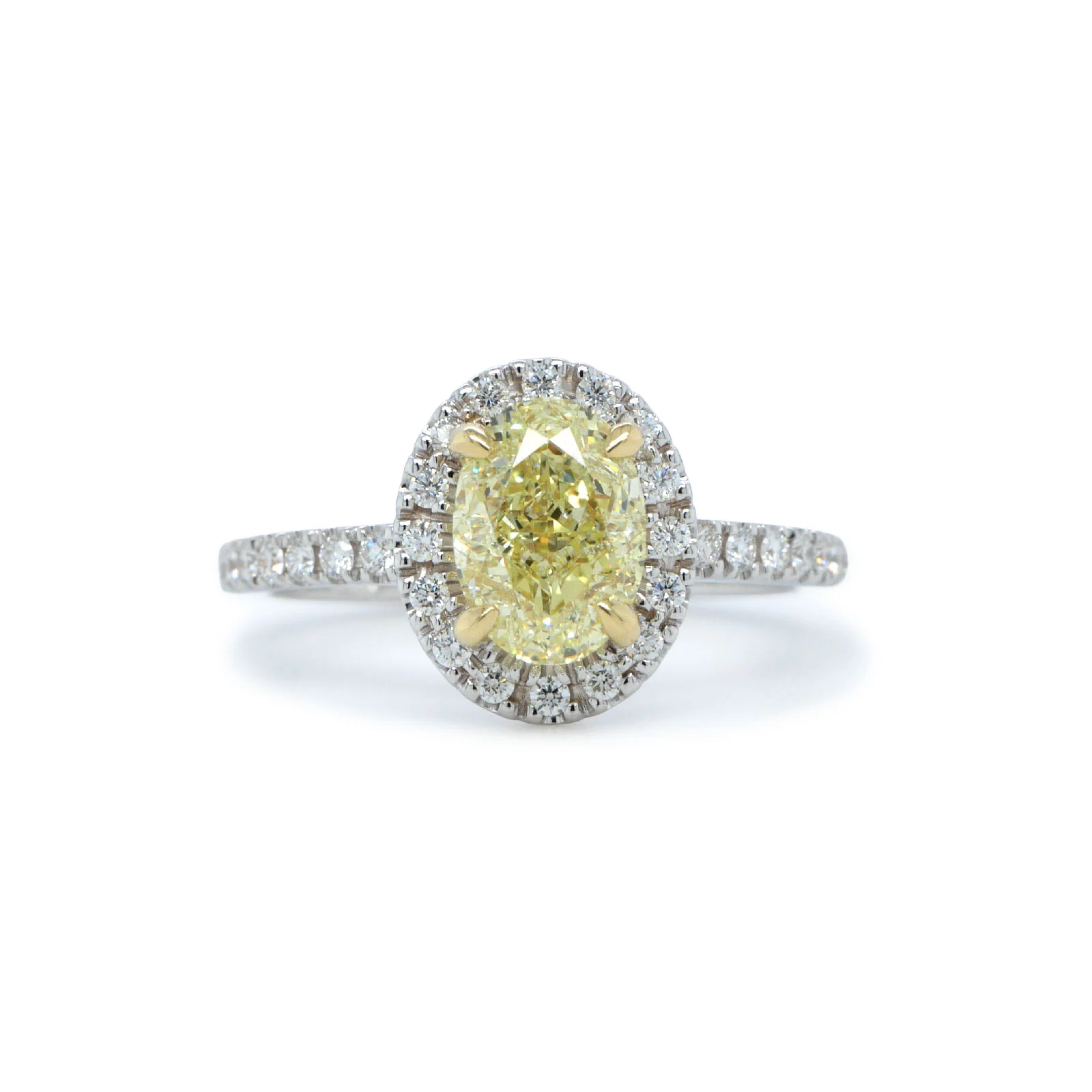 This exquisite halo ring showcases a 1.18 carat Fancy Yellow oval diamond, certified by GIA with a clarity grade of SI1.
