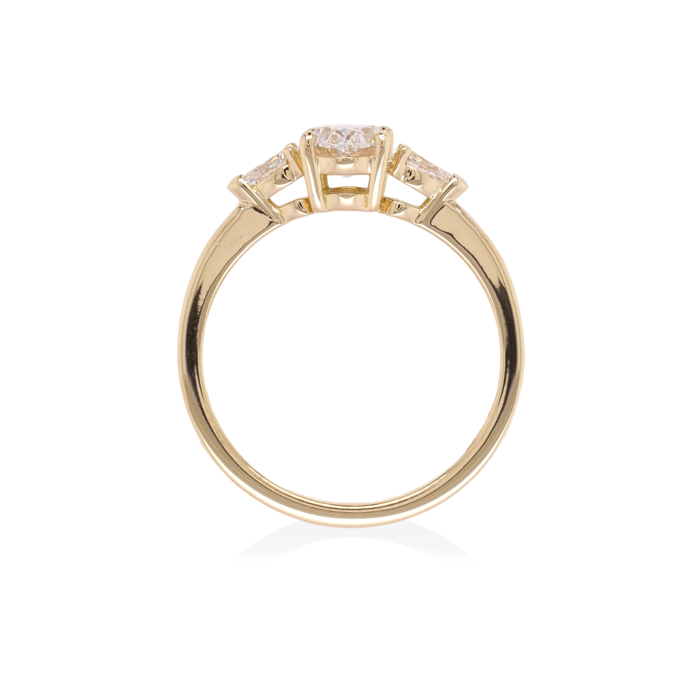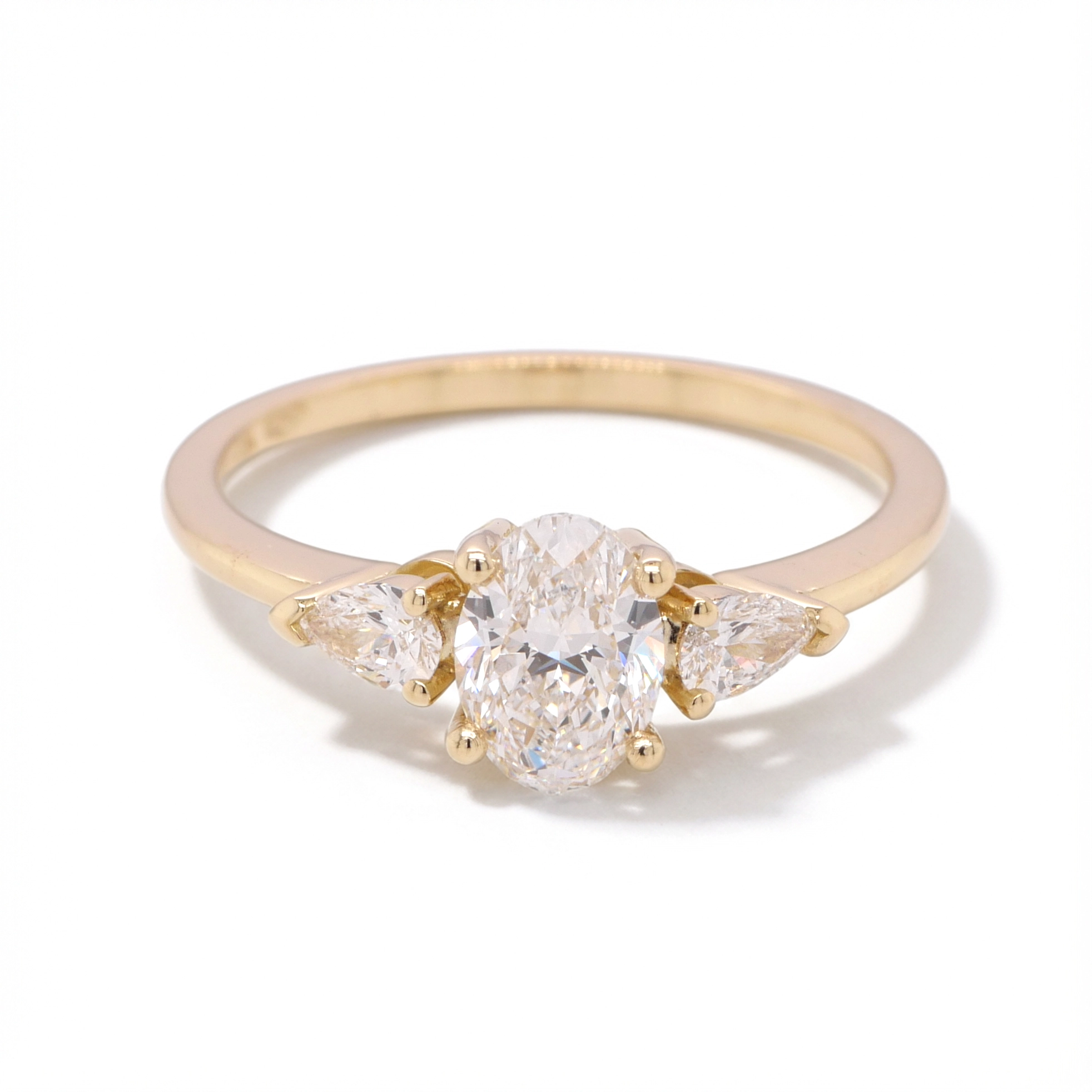 This three-stone ring in 18k yellow gold showcases a 0.73 ct E VS2 oval-cut diamond, GIA-certified, offering excellent brightness and a clean, crisp appearance.