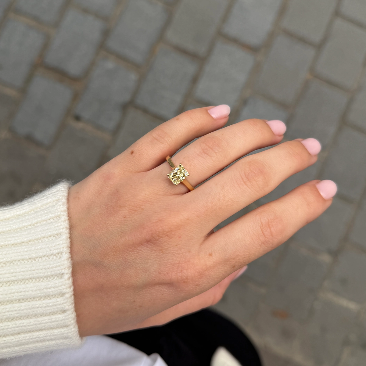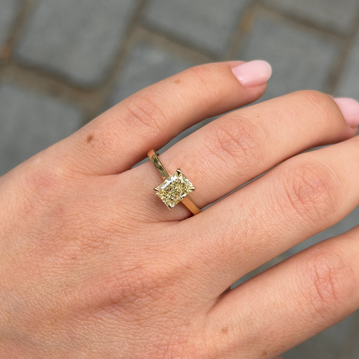 La fascia in oro giallo 18k esalta le tonalità morbide del diamante, creando un equilibrio armonioso tra lusso e design contemporaneo.