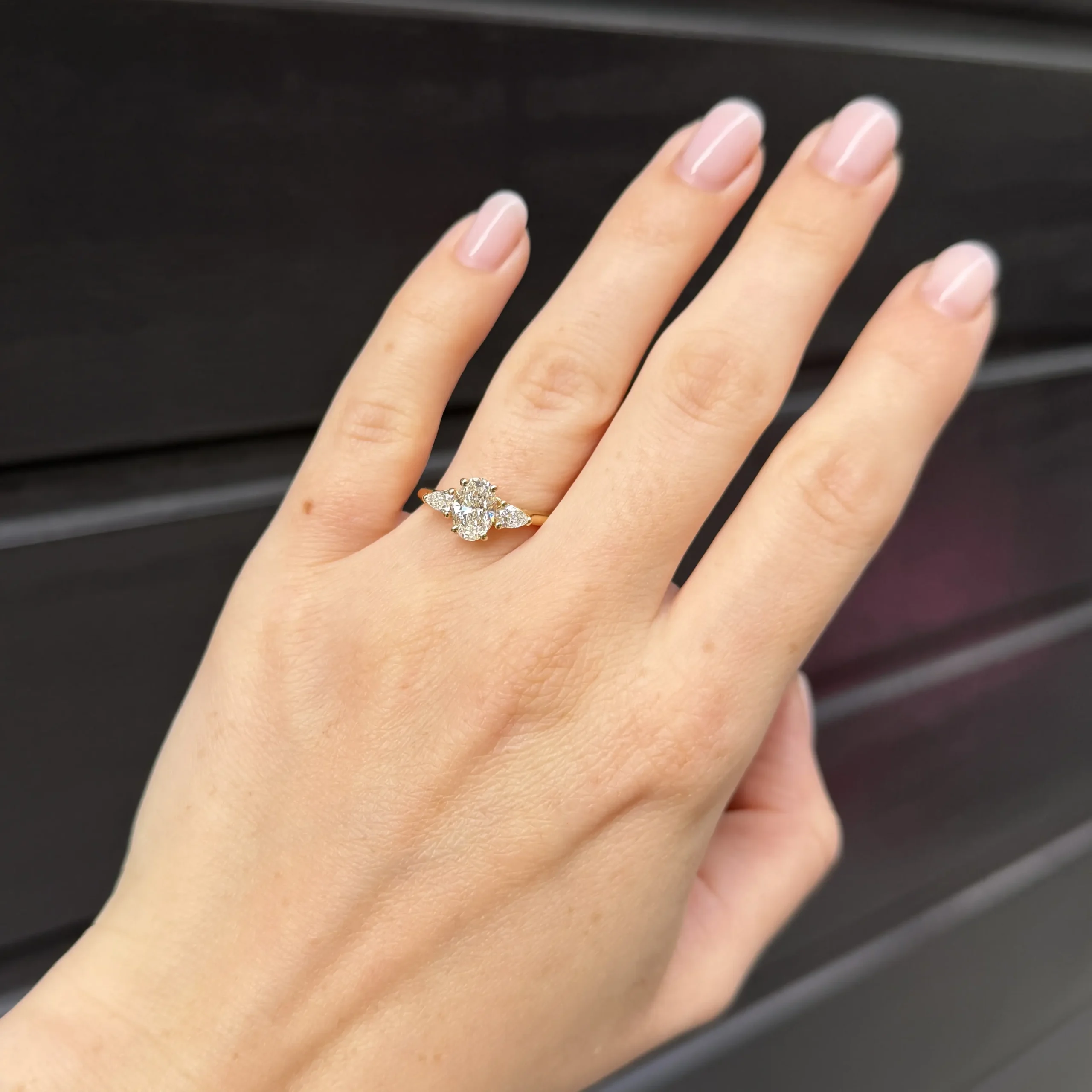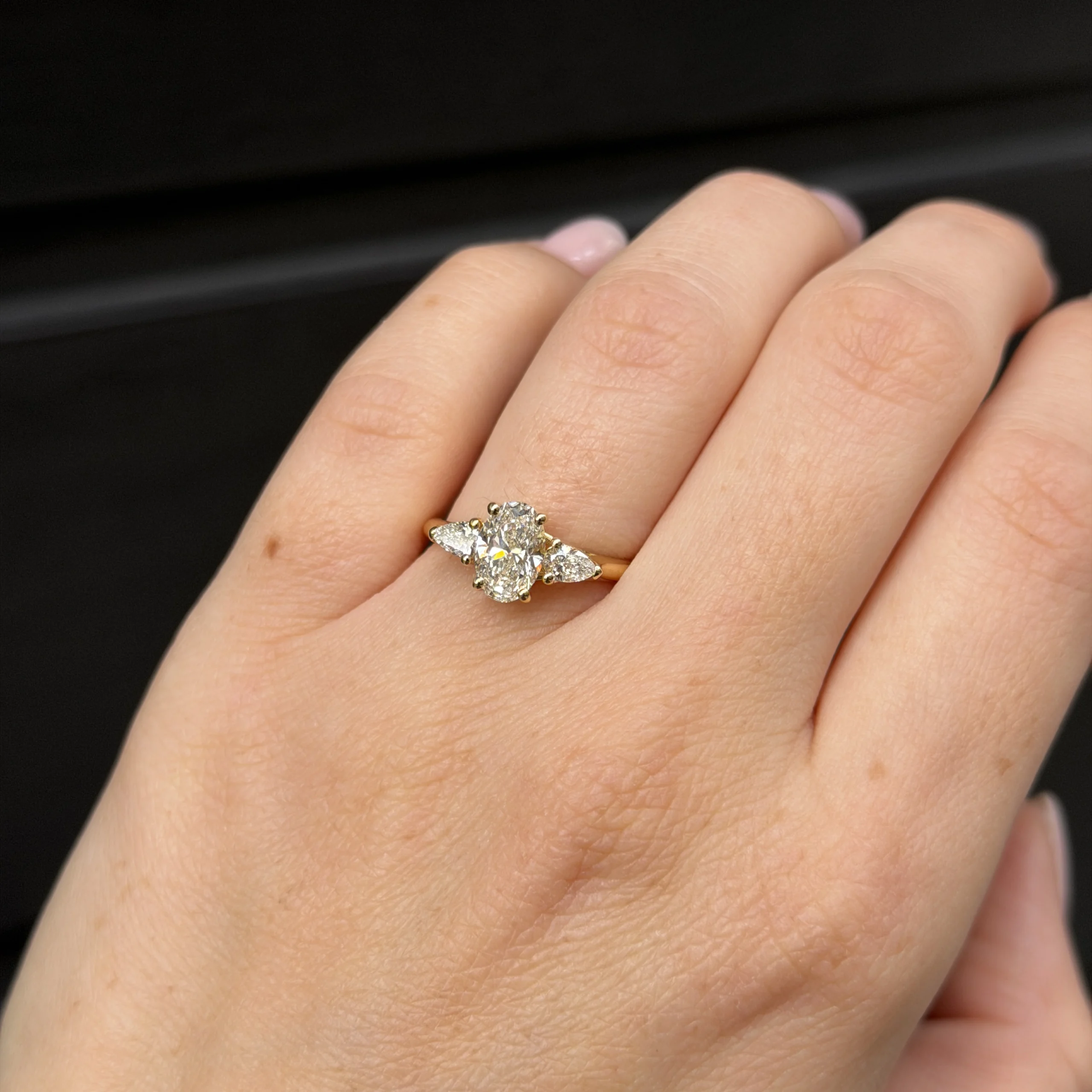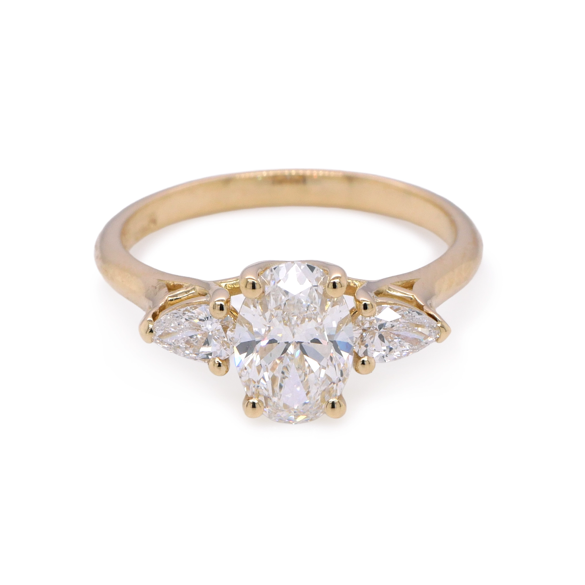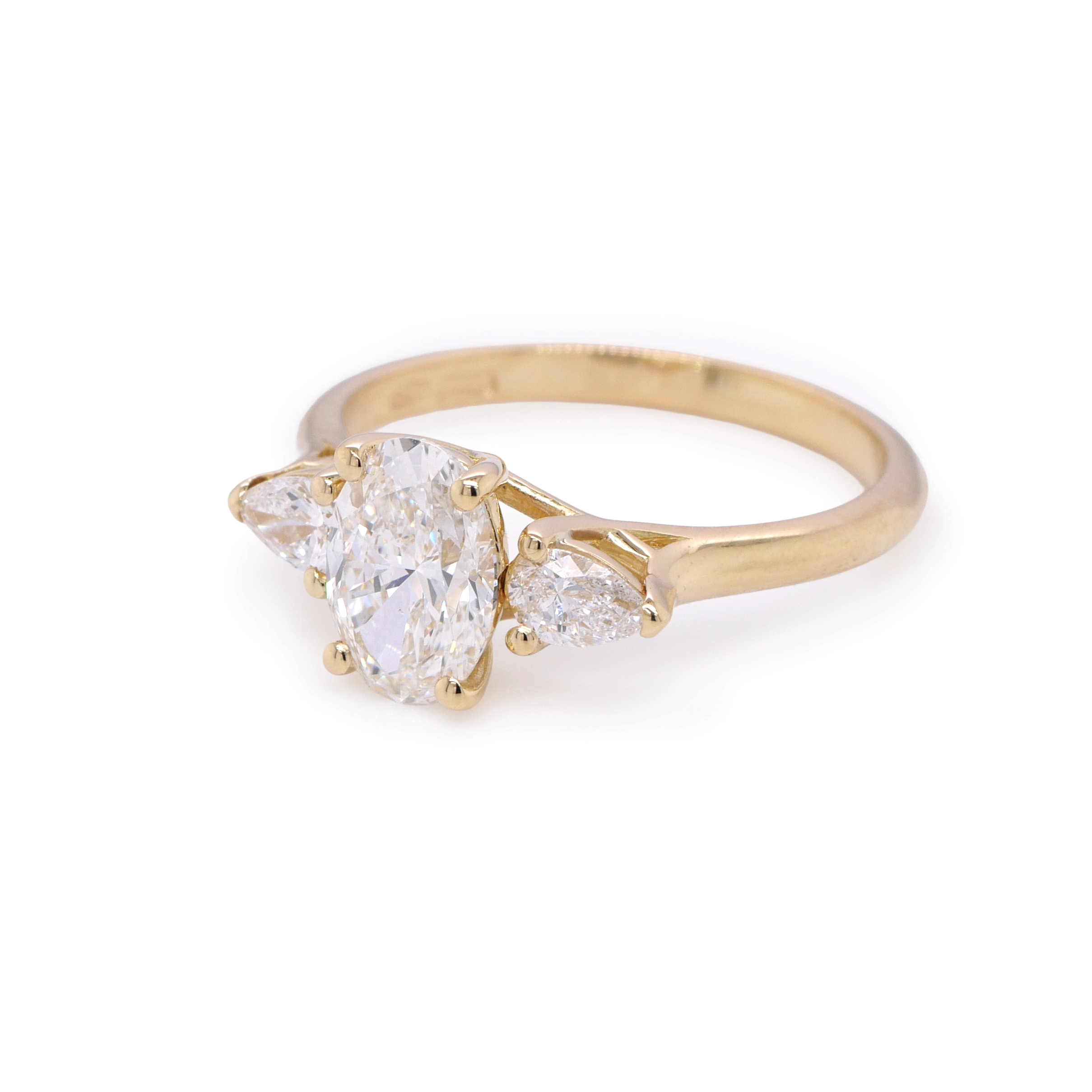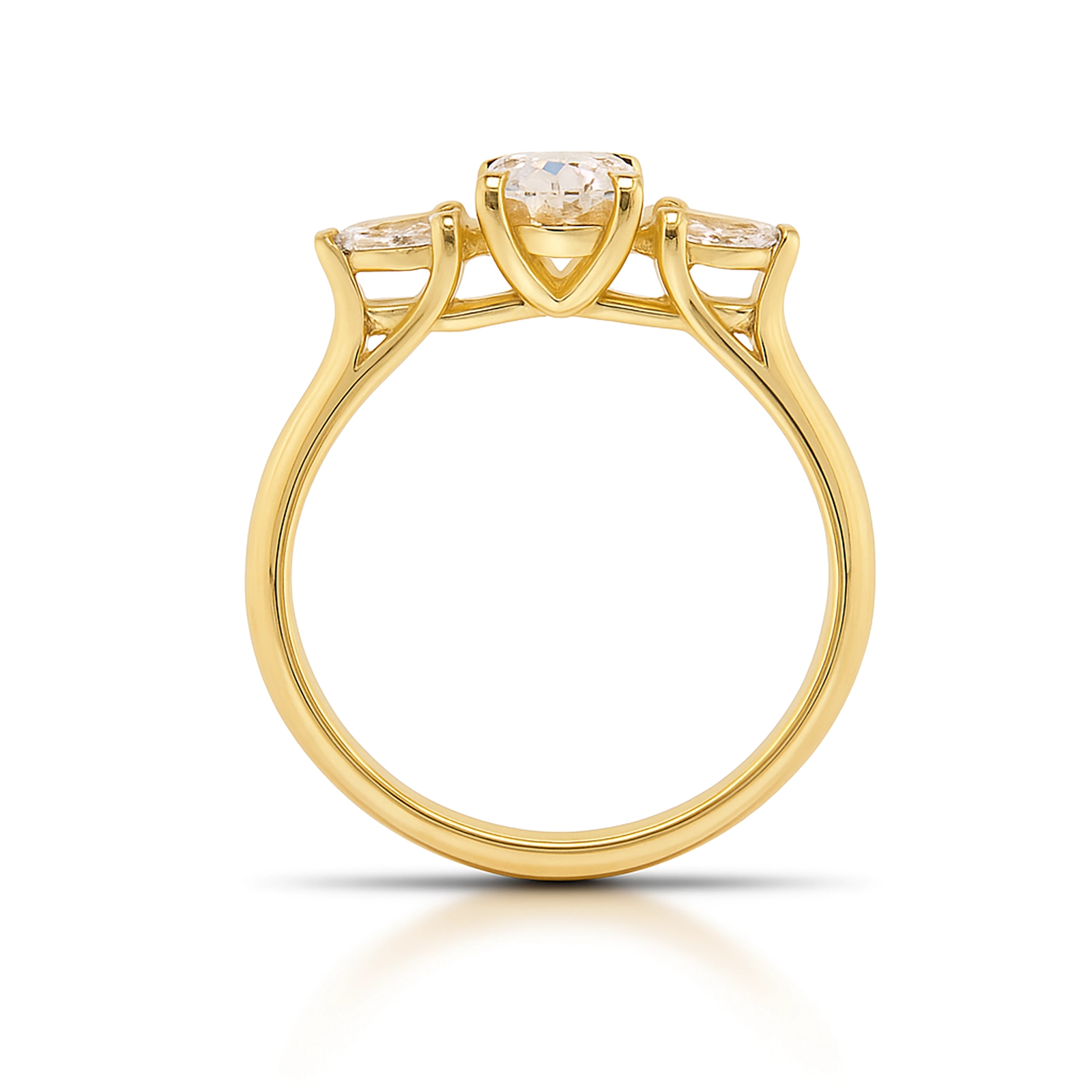 Ai lati, due diamanti taglio pera per un totale di 0.28 carati incorniciano la pietra centrale, aggiungendo movimento e luce. La montatura in oro giallo 18K, dal profilo morbido e raffinato, esalta la luminosità dei diamanti grazie al contrasto tra il calore del metallo e la purezza delle gemme.