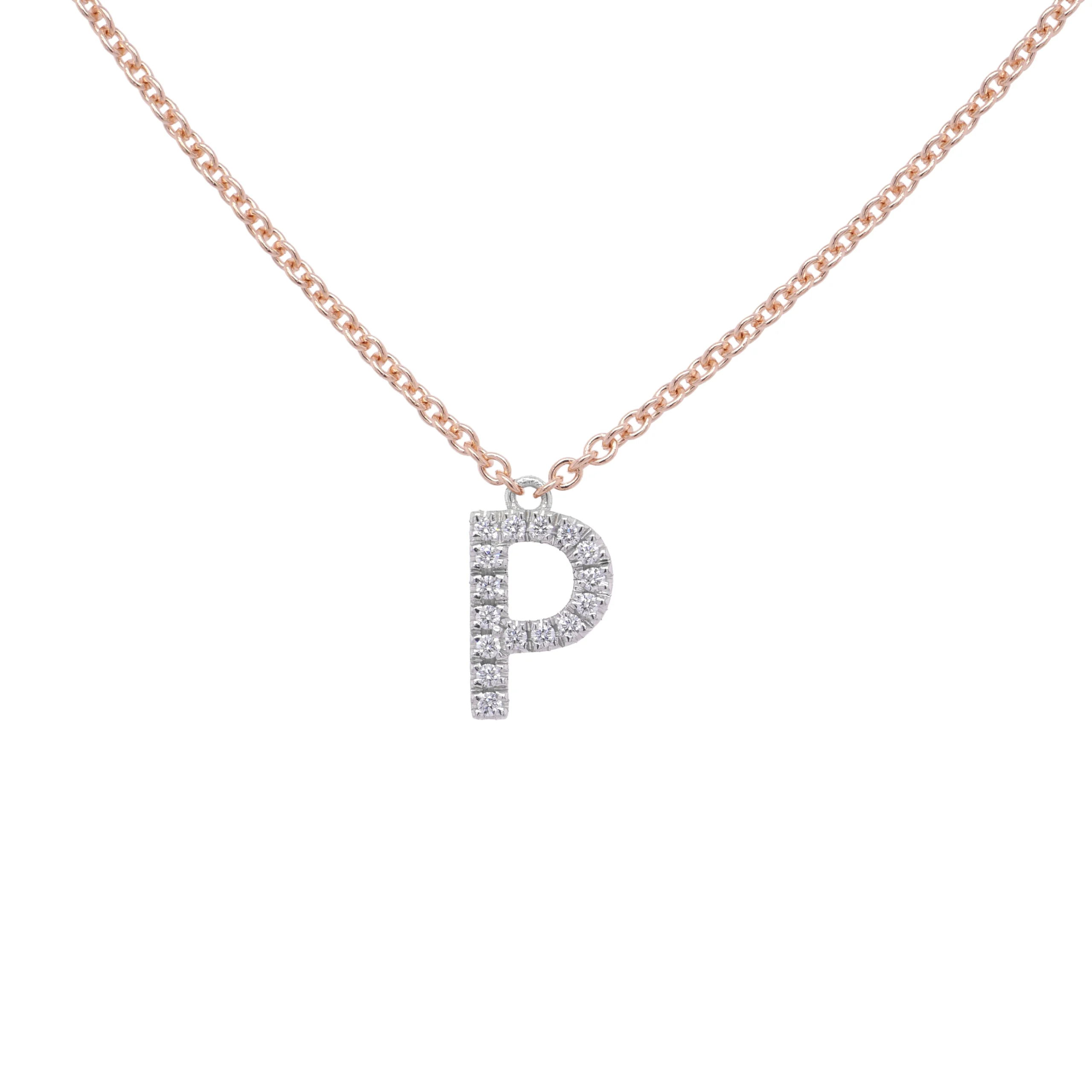 Collana elegante e personale con pendente a forma di lettera P, realizzato in oro bianco 18K e incastonato con diamanti naturali.