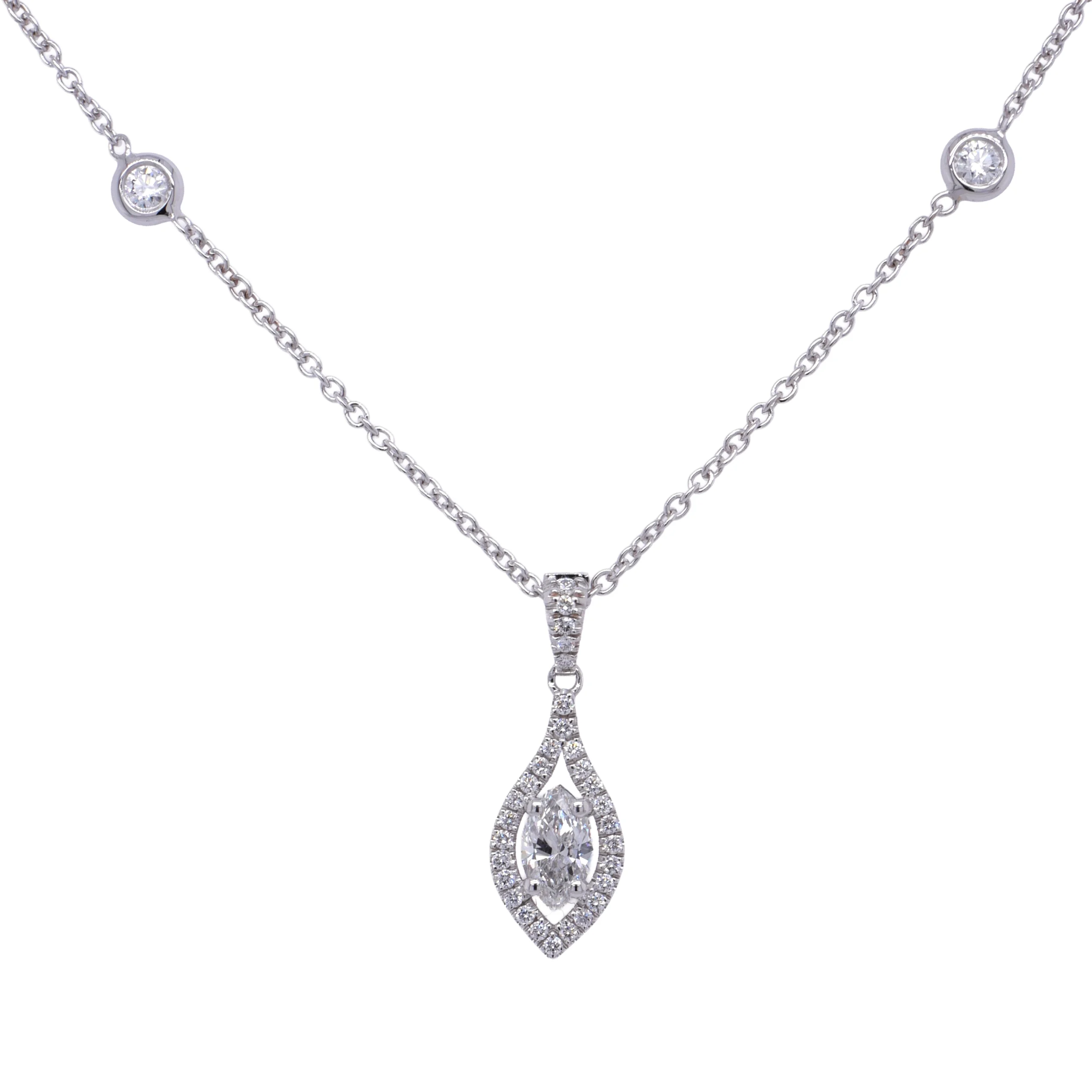 Questa collana presenta un diamante marquise da 0,30 ct, certificato HRD, incastonato al centro di un halo luminoso che valorizza la sua forma allungata e la brillantezza naturale.