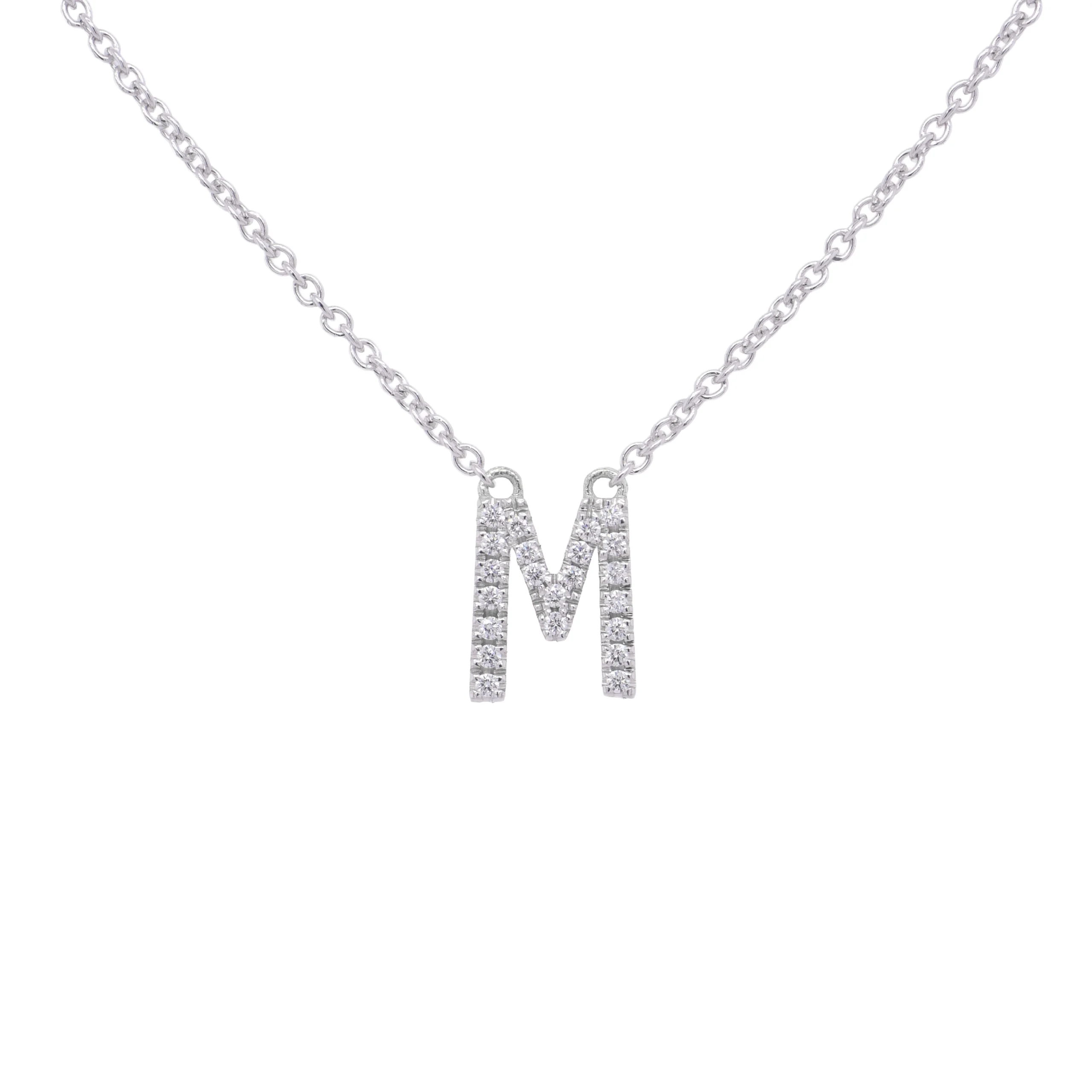 Verfijnde en minimalistische ketting met de letter M, uitgevoerd in massief 18K witgoud en afgewerkt met pavégezette natuurlijke diamanten.