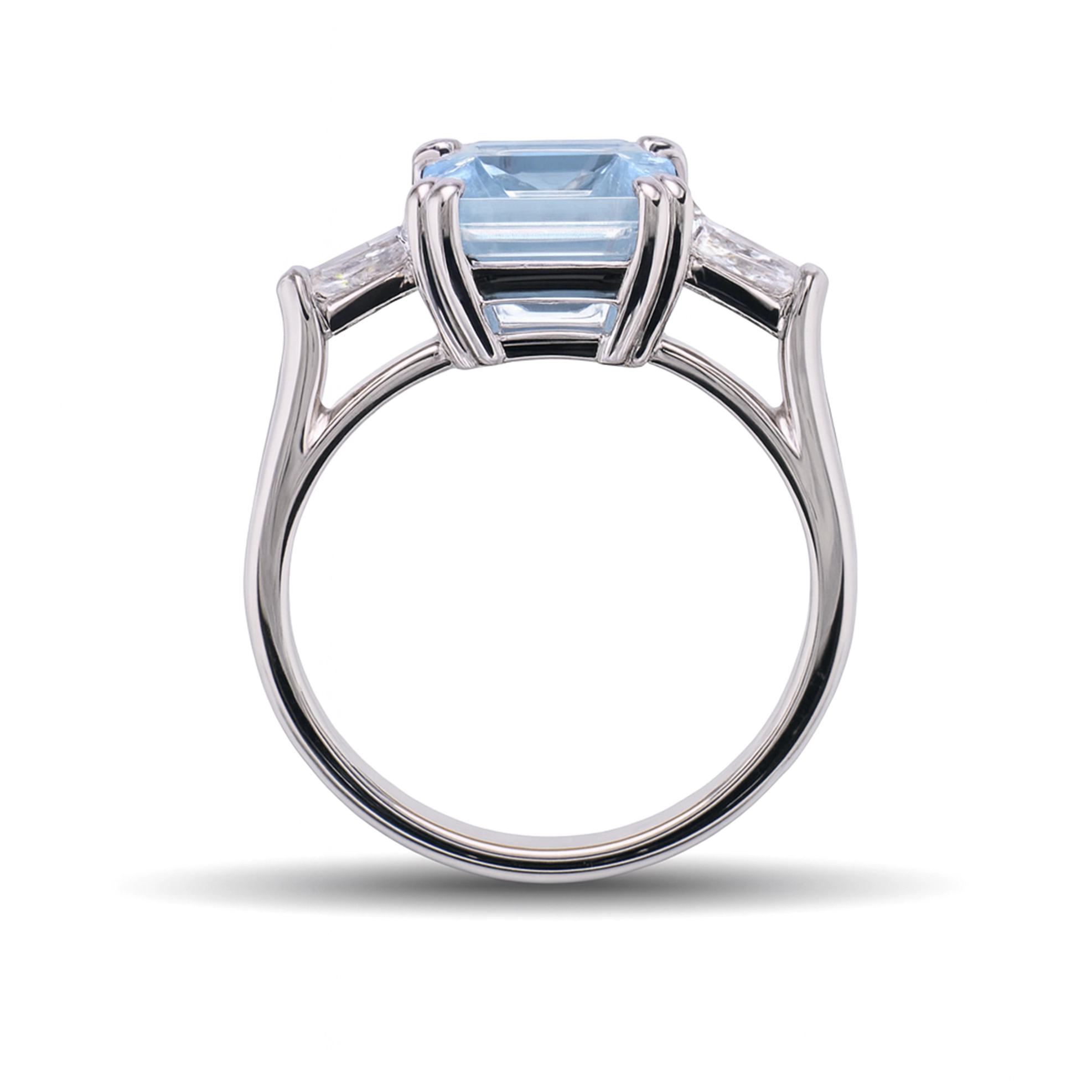 Het middelpunt wordt gevormd door een 3,88 ct aquamarijn, geslepen in een smaragdslijpvorm die zijn kristalheldere blauwe kleur en diepte versterkt.