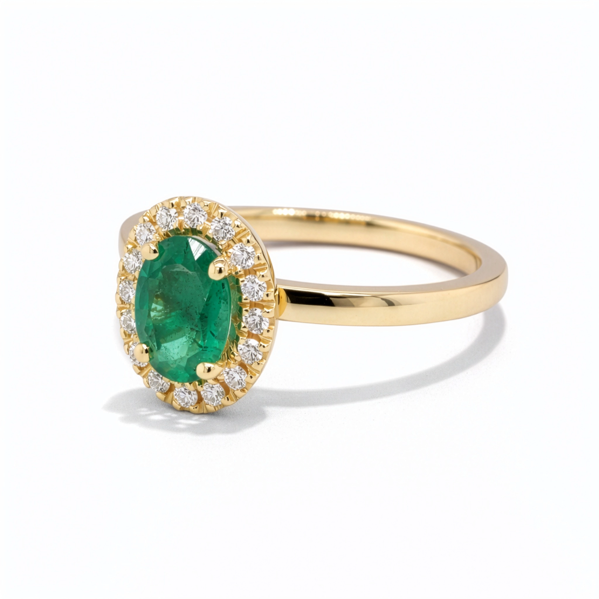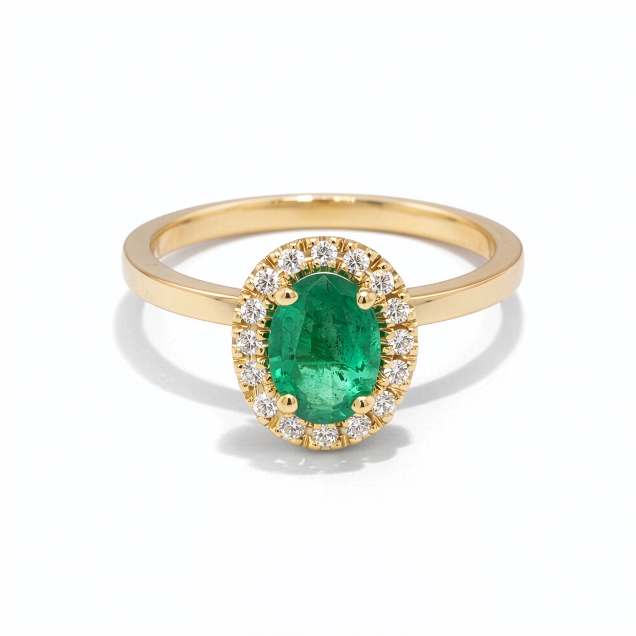 Deze elegante ring is voorzien van een ovale smaragd van 0,64 ct, geselecteerd om zijn diepe groene kleur en natuurlijke uitstraling.