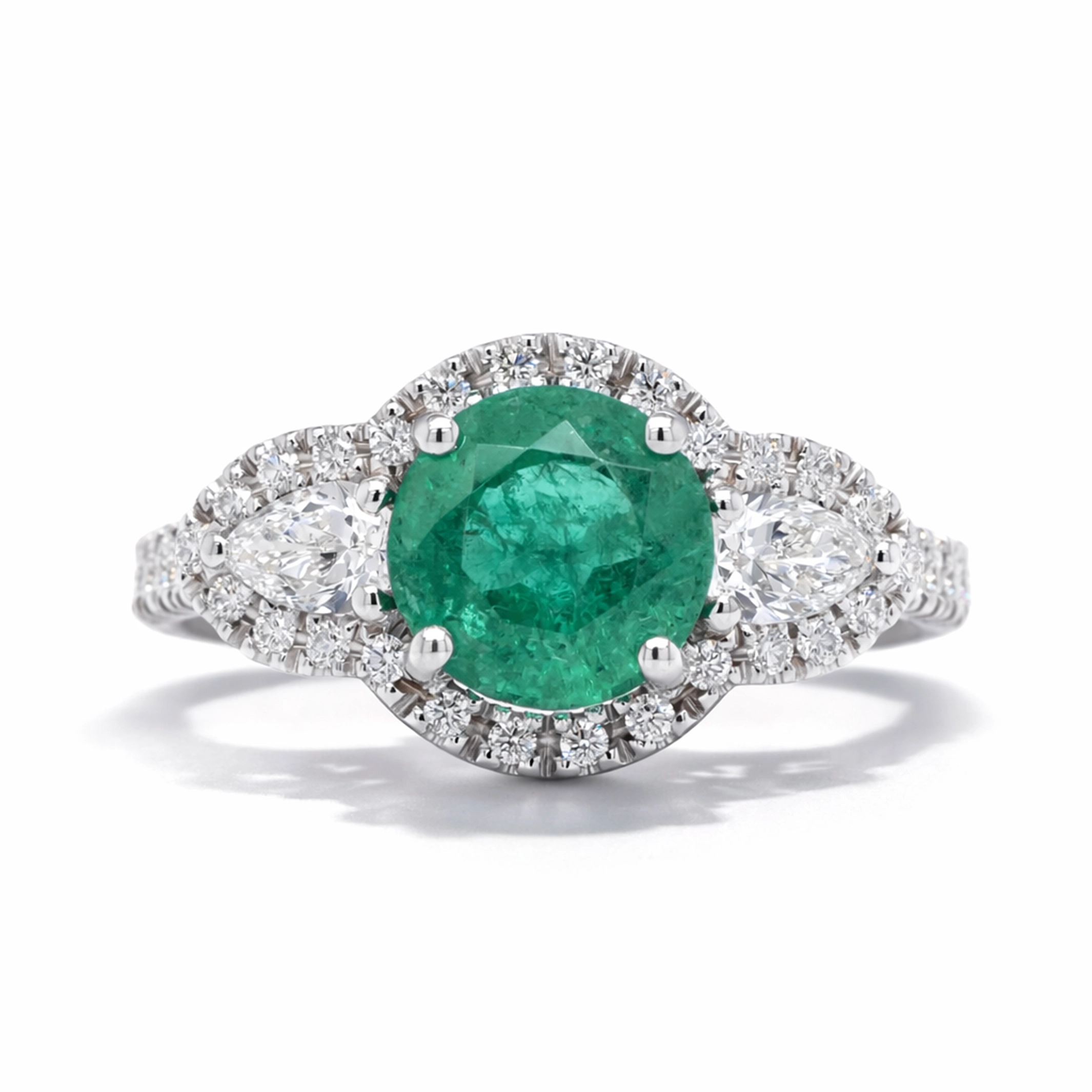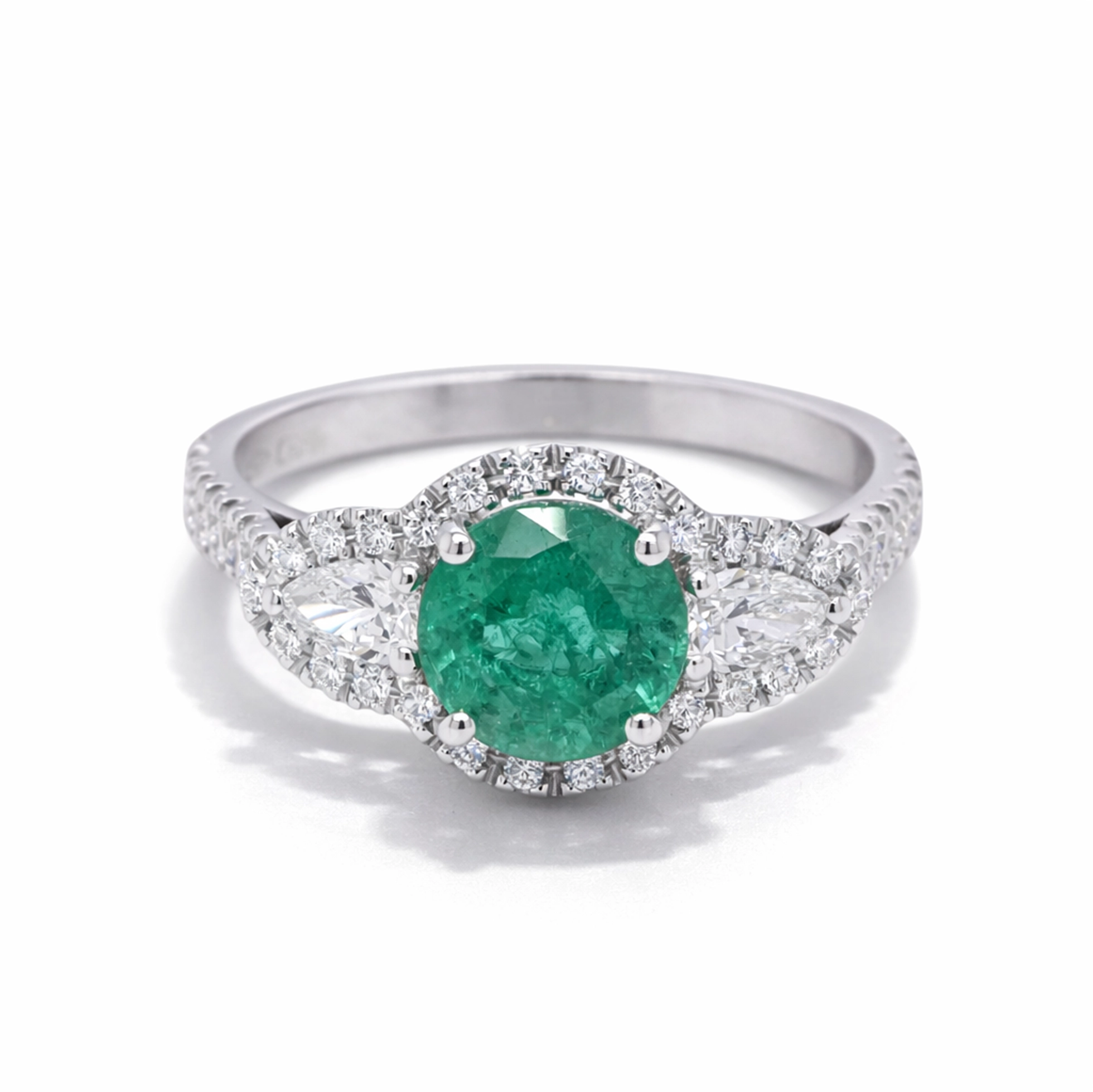 Aan weerszijden van de smaragd bevinden zich twee peervormige diamanten met een totaalgewicht van 0,28 karaat, kleur F en zuiverheid VS.